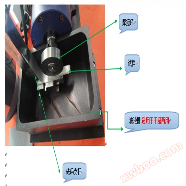 2、 Functional features: 1. Sample size: 30mm × 7mm × 6mm 2. Rotation speed: 0-200 revolutions per minute (adjustable) 3. Load: 196N ± 0.1% (can be increased to 392N) 4. Friction ring size: ¢ 40 × 10mm, chamfer 0.5 × 45 °, with a concentricity deviation of less than 0.01 between the outer and inner surfaces? 5. Friction ring material: 45 steel, quenched, heat treated HRC40-45, outer surface smoothness ▼ 8 6, friction torque: 0-10N · m 7, weight: one 4KG weight, four 1KG weights, can achieve weight superposition function.