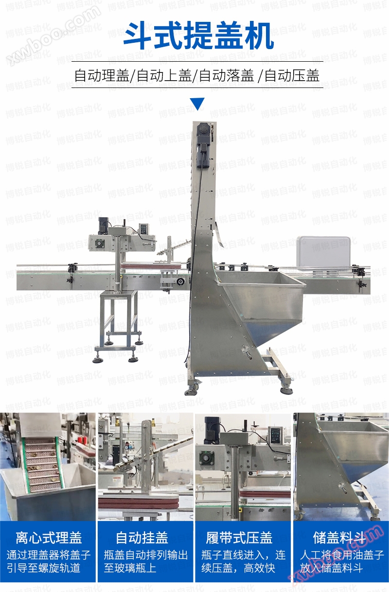 This lifting cover is mainly suitable for industries such as pharmaceuticals, food, chemicals, and daily chemical products, and is an ideal supporting equipment for automatic production lines such as capping machines and capping machines. Replacing traditional manual cover with bottom cover makes automation work more convenient and efficient. Especially for bottle caps that require no wear and tear, such as printed caps that need to be produced or packaged in the next step, this equipment can effectively reduce wear and tear; Its working principle is to detect the effect of micro switches, and through the conveying scraper, the bottle caps in the hopper are uniformly fed into the cap sorting machine according to production needs, ensuring that the bottle caps in the cap sorting machine can be kept in good condition;