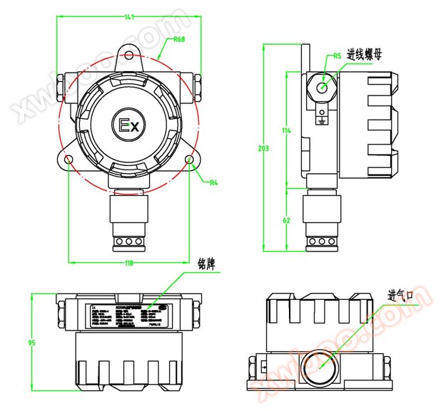 Product Introduction With the rapid development of industry, there are more and more occasions where humans come into contact with harmful gases, resulting in increasing harm to humans themselves. The repeated poisoning accidents have made people realize the importance of protecting human safety while developing industry. Therefore, various harmful gas alarm devices have gradually become essential protective equipment in industrial safety production. KQ500-EX point type combustible gas detector is a new product developed by our company using advanced catalytic combustion sensors and years of experience in gas detection probe research. It has high accuracy, accurate measurement, anti-interference, stable performance, high sensitivity, and fast response time. It can be widely applied in many special industries and fields such as metallurgy, petroleum, petrochemical, chemical, light industry, coking, municipal, gas, pharmaceuticals, sewage treatment, etc. The instrument adopts explosion-proof design, with a 4-20mA standard signal three wire output, which can be transmitted over long distances and directly enter the DCS system. The probe has the characteristics of high sensitivity, rapid response, long service life, and short response time, and is at the leading level of similar products in China. Technical Specifications