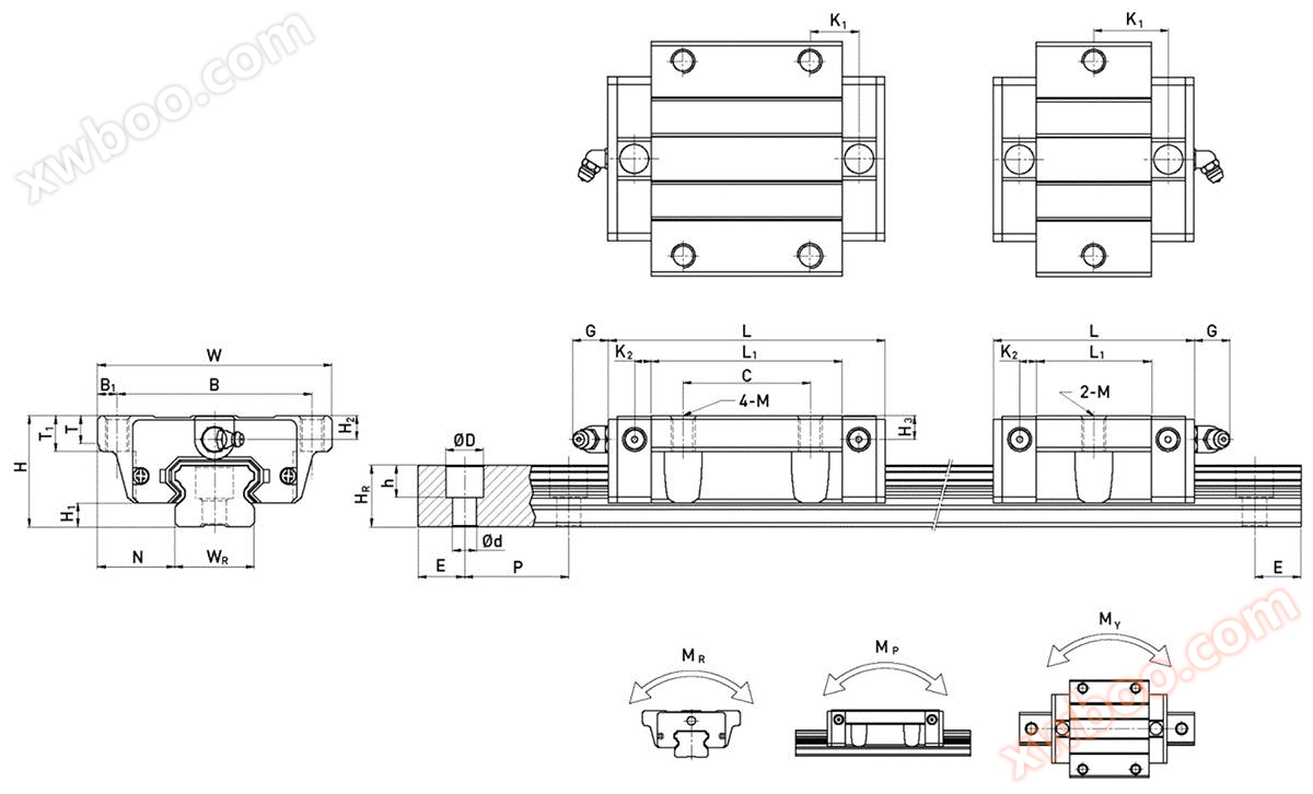 H H1 N W B B1 C L1 L K1 K2 G M T T1 H2 H3 WR HR D h d P E (mm) c(kn) C0(kn) MRkgf-m MPkgf-m MYkgf-m Sliding block kg Guide rail kg/m