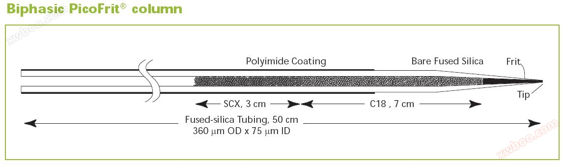 Two phase PicoFrit®It is a two section fixed column with a total length of 10cm. It consists of two sections: a H020 high-quality strong cation exchange (SCX) 5 μ m filler (labeled as # # H020) with a length of # # (mm), and another section of other fillers (labeled as # # XXXX) with a length of # # (mm).